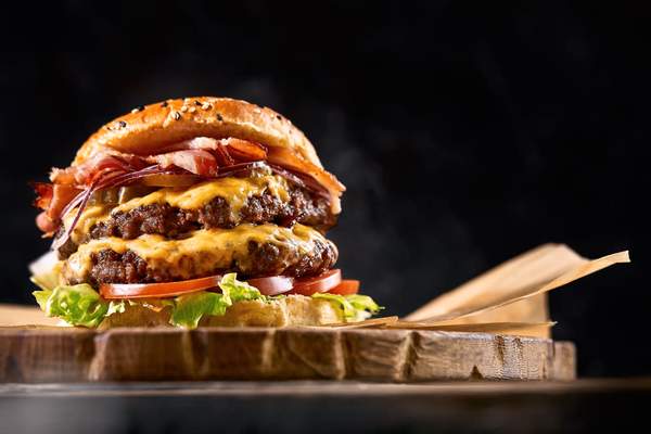 Chiflă burger, chiftea burger asezonată cu sos BBQ, dulceață de ceapă, bacon prăjit, salată iceberg, o felie de roșie si 4 inele de ceapă prăjită Ingrediente: Chifle Hamburger (Conține Gluten, Susan) - 80g, Inele de ceapa (Conține Gluten)* - 66g, Carne tocată de porc* - 55g, Carne tocata vita* - 55g, Roșie - 30g, Sos barbeque [Amidon modificat: Adipat de diAmidon acetilat (E 1422)] - 30ml, Salata iceberg - 30g, Bacon afumat [Conservant: Nitrit de sodiu (E 250)] - 20g Valori nutritionale (exprimate la 100g): KJ: 798.2, Kcal: 190.8, Grasimi: 9.1, Acizi grasi saturati: 1.5, Glucide: 17.2, Zaharuri: 4.5, Proteine: 8.3, Sare: 0.8 Alergeni: Cereale care contin gluten (grau, secara, orz, ovaz, grau spelt, grau mare sau hibrizi ai acestora) si produse derivate, Oua si produse derivate, Soia si produse derivate, Lapte si produse derivate (inclusiv lactoza), Mustar si produse derivate