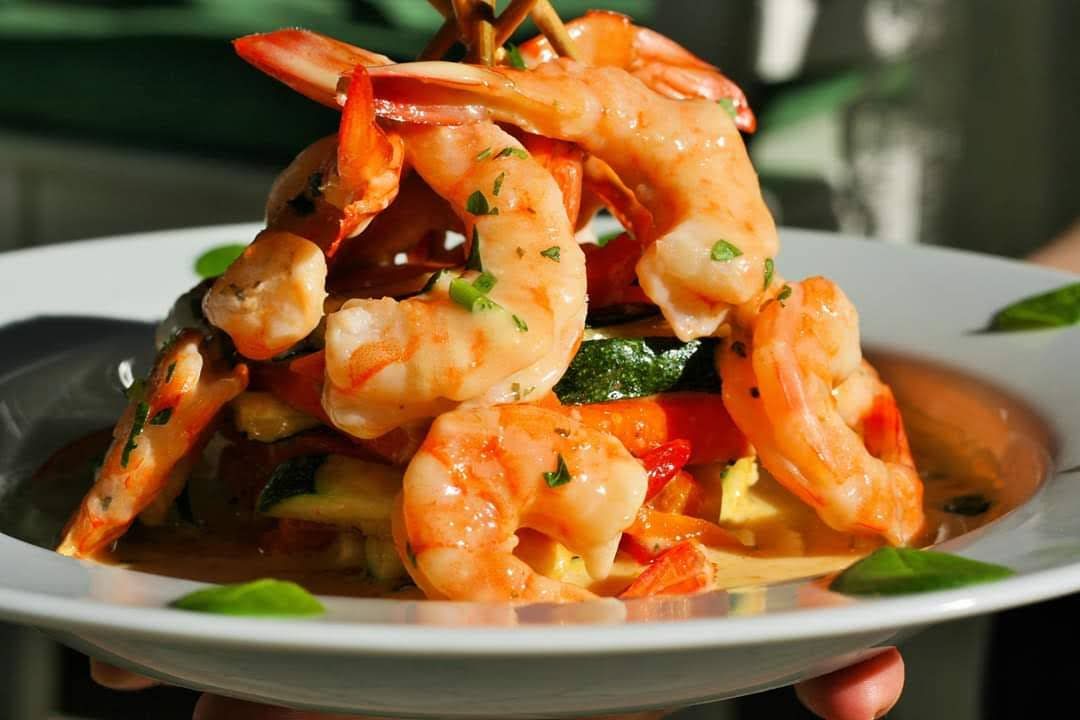 Creveți (aprox. 200 gr în crud), decorticați, se prepară în sos de de cocos (lapte de cocos, usturoi, pătrunjel) și se servesc cu legume la cuptor (dovlecei, morcovi, ardei capia copt), capere, alergeni: crustacee, gluten (pâinea) – 400 gr/90 gr.