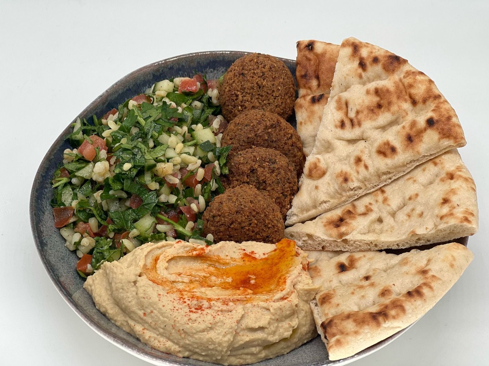 Falafel 4 buc (năut, pătrunjel, ceapă, usturoi granule, ulei floarea soarelui, coriandru, chimion, piper alb, sare), tabouleh cu bulgur, humus, 1/2 lipie, salată verde) - 300 g