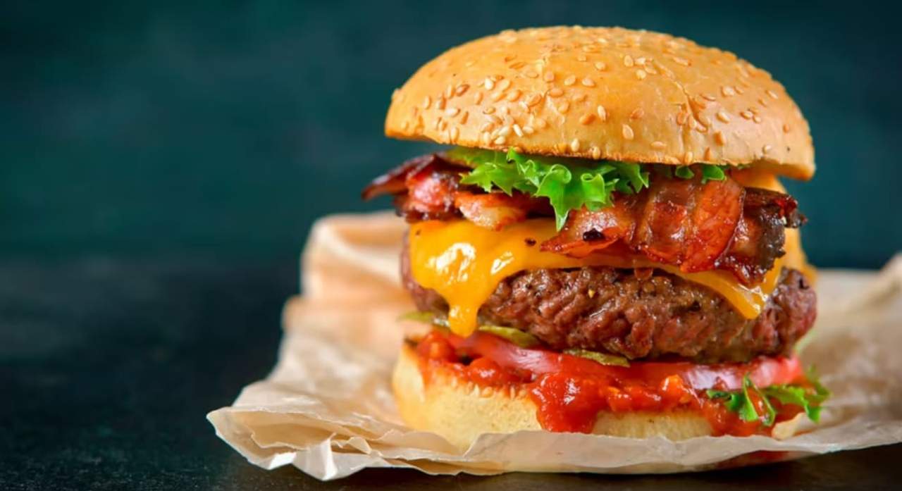 Chiflă brioche, carne de vită, brânză cheddar, bacon, roșii, castraveți murați, ceapă roșie, maioneză, ketchup, sos burger, cartofi prăjiți, salata