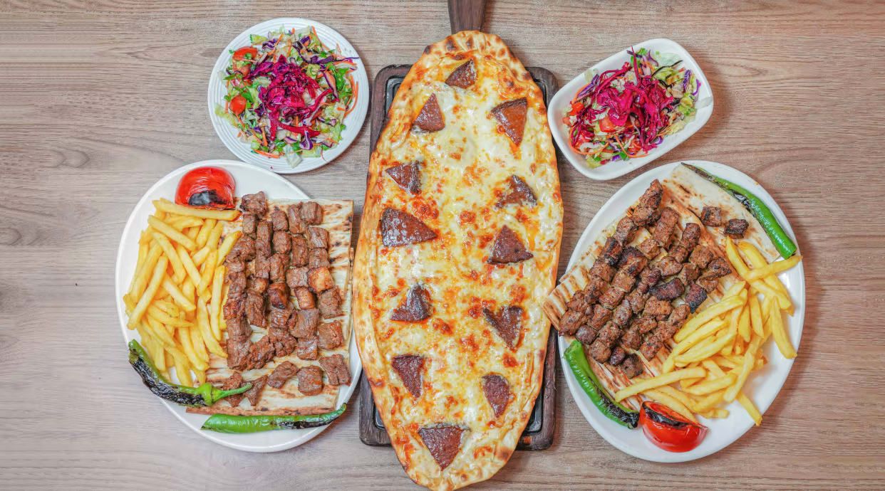 Coaste de berbecut 450g, ceapa cu sumac 50g, rosii 50g, varza 50g, lamiae 50g, paine 100g, cartofi 150g, sos bbq 30g.
