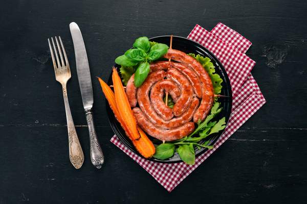 cartofi prajiti 150g, carnat 80g, ketchup 20g, mustar 20g