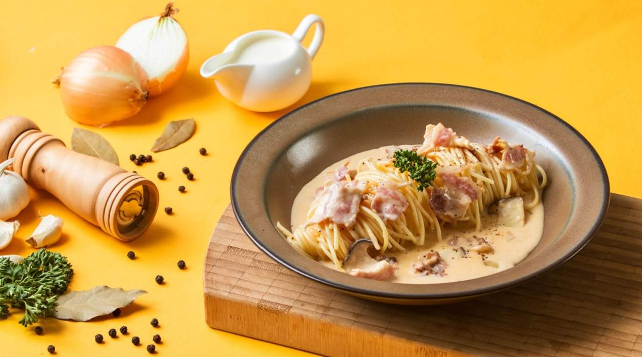 Spaghete*, guanciale, Grana Padano, ou, stock de pui* 380g, 413.84 Kcal/100g. 4E Ingredientele selecționate conțin alergeni: 1, 3, 7, 9