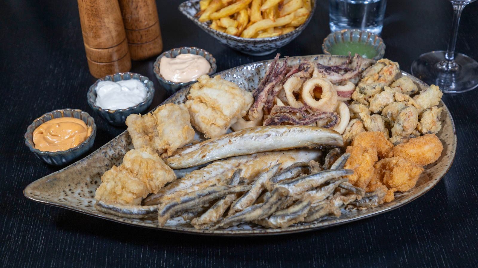 File de macrou la plita 240g, merluciu pane 100g, hamsie prajita 100g, calamar pane 100g, creveti pane 100g, midii pane 100g, cartofi proaspeti prajiti 500g, sos mujdei 40ml, sos picant maioneza sriracha 40ml, sos maioneza usturoi 40 ml, lamaie, faina, pezmet, ulei de floarea soarelui, sare. Informații nutriționale 100g Valoare Energetică (kJ/kcal): 1026.6 / 230.2, Grăsimi (g): 14.9 din care: Acizi grași saturați (g) 1.4, Glucide (g): 12.1 din care: Zaharuri (g): 0.9, Proteine (g): 10.3, Sare (g): 1.4 Informații nutriționale porție (1360.00g) Valoare Energetică (kJ/kcal): 13961.8 / 3130.4, Grăsimi (g): 202.62 din care: Acizi grași saturați (g): 19.46, Glucide (g): 165.1 din care: Zaharuri (g): 11.62, Proteine (g): 139.88, Sare (g): 18.46 Alergeni Conține: Gluten, Crustacee, Ouă, Pește, Arahide, Soia, Lapte, Nuci, Țelină, Muștar, Susan, Sulfiți, Lupin, Moluște *provenit din produse congelate