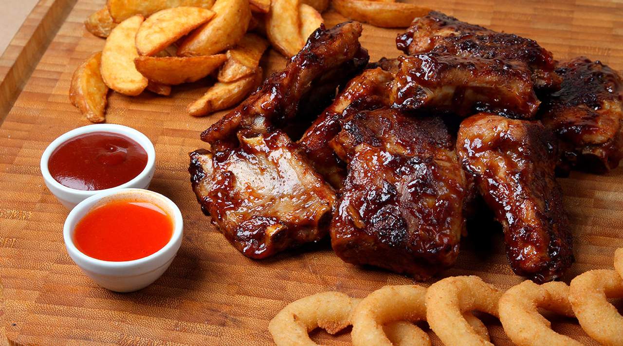 Marinate cu amestecul de condimente secret, usor afumate si gatite incet cu grija, vin servite cu baked beans, salata coleslaw, cartofi prajiti si onion rings – 950g