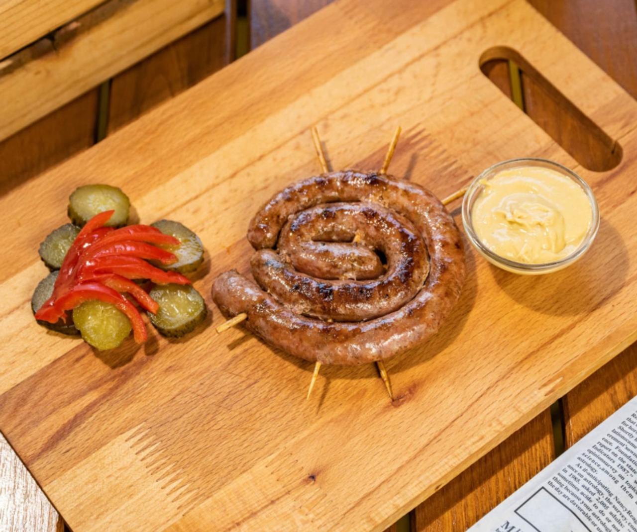 Ceafă de porc, cotlet de porc, piept de pui, pulpă de pui, cârnăciori, mici, cartofi prăjiți, castraveți murați