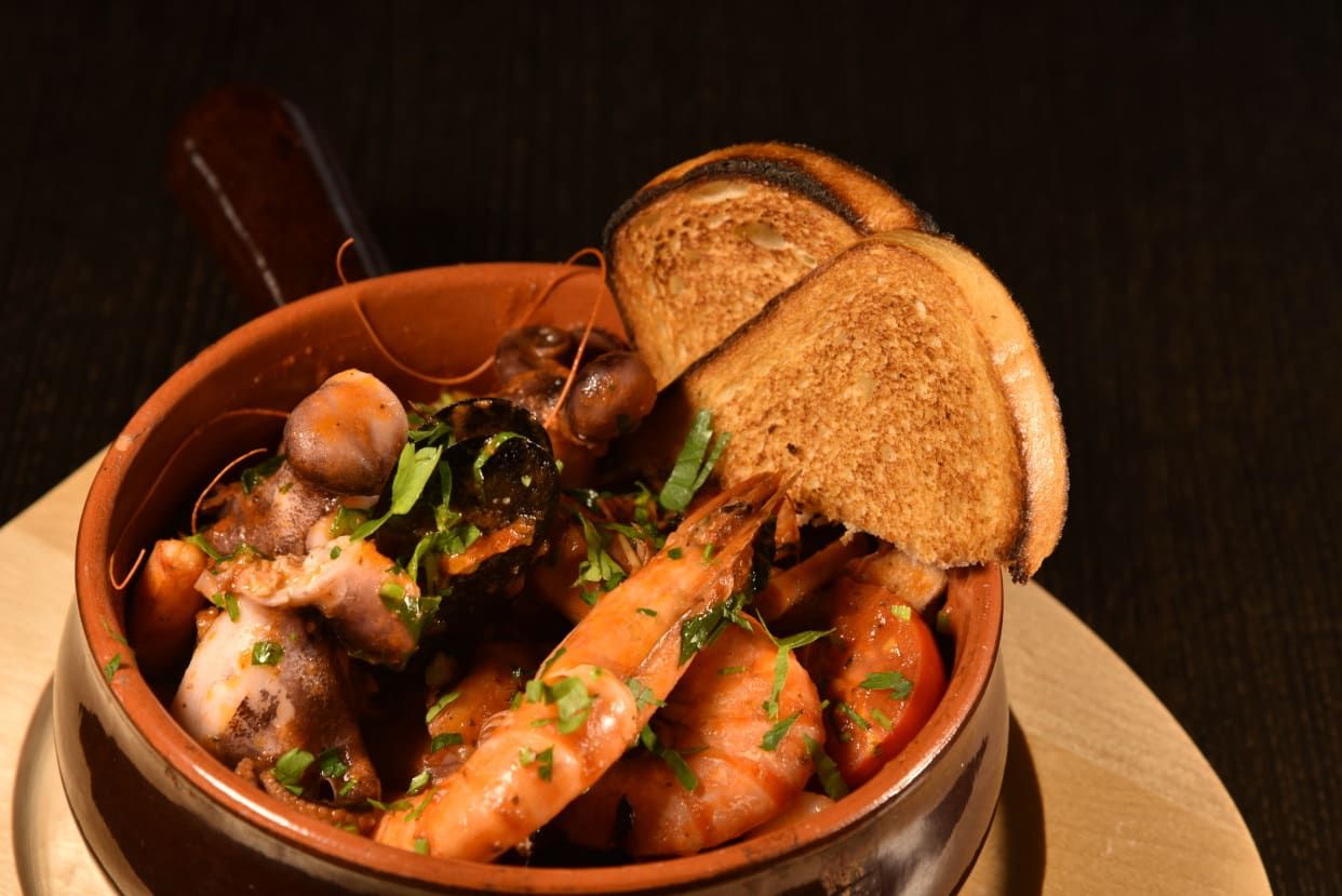 Creveți decorticați 200g, ulei de măsline 100ml, usturoi 50g, boia dulce, pătrunjel ,pâinea casei 140 gr