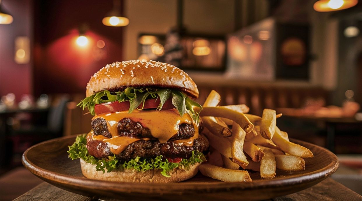 Chifla, palina carne, sos burger, salata iceberg, castraveti murati, rosii, ceapa - 350g Cartofi prajiti 150gr
