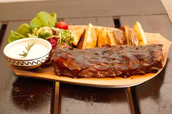 costite marinate, cartofi copși, sos barbeque, sos rosa -500 gr