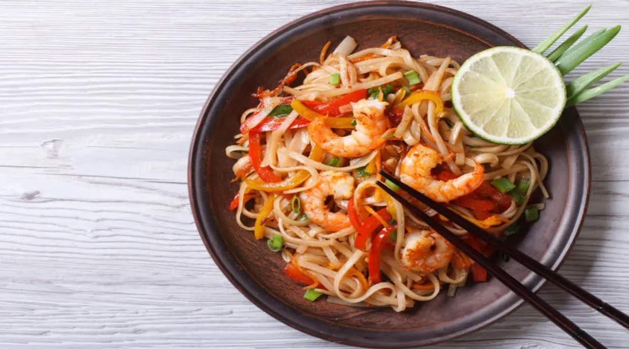 Rice noodles prăjiți cu creveți - tăiței de orez, creveți, varză, morcovi, praz, ou, sos de soia, usturoi - 350g