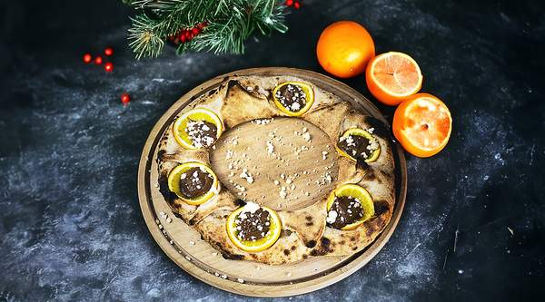 Blat de pizza, arome de Crăciun, ciocolată, portocale, scorțișoară și crumble de ciocolată albă (450g) ⚡ Valoare energetică: 181 Kcal / 757.304 Kj, Grăsimi: 3,84 g, Acizi Grași Saturați: 1,41 g, Glucide: 30,07 g, Zaharuri: 7,71 g, Proteine: 4,15 g,