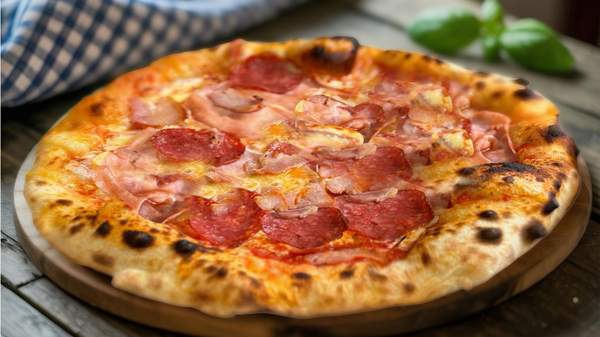 Aluat, sos roșii, mozzarella, salam, prosciutto cotto, bacon - 590g
