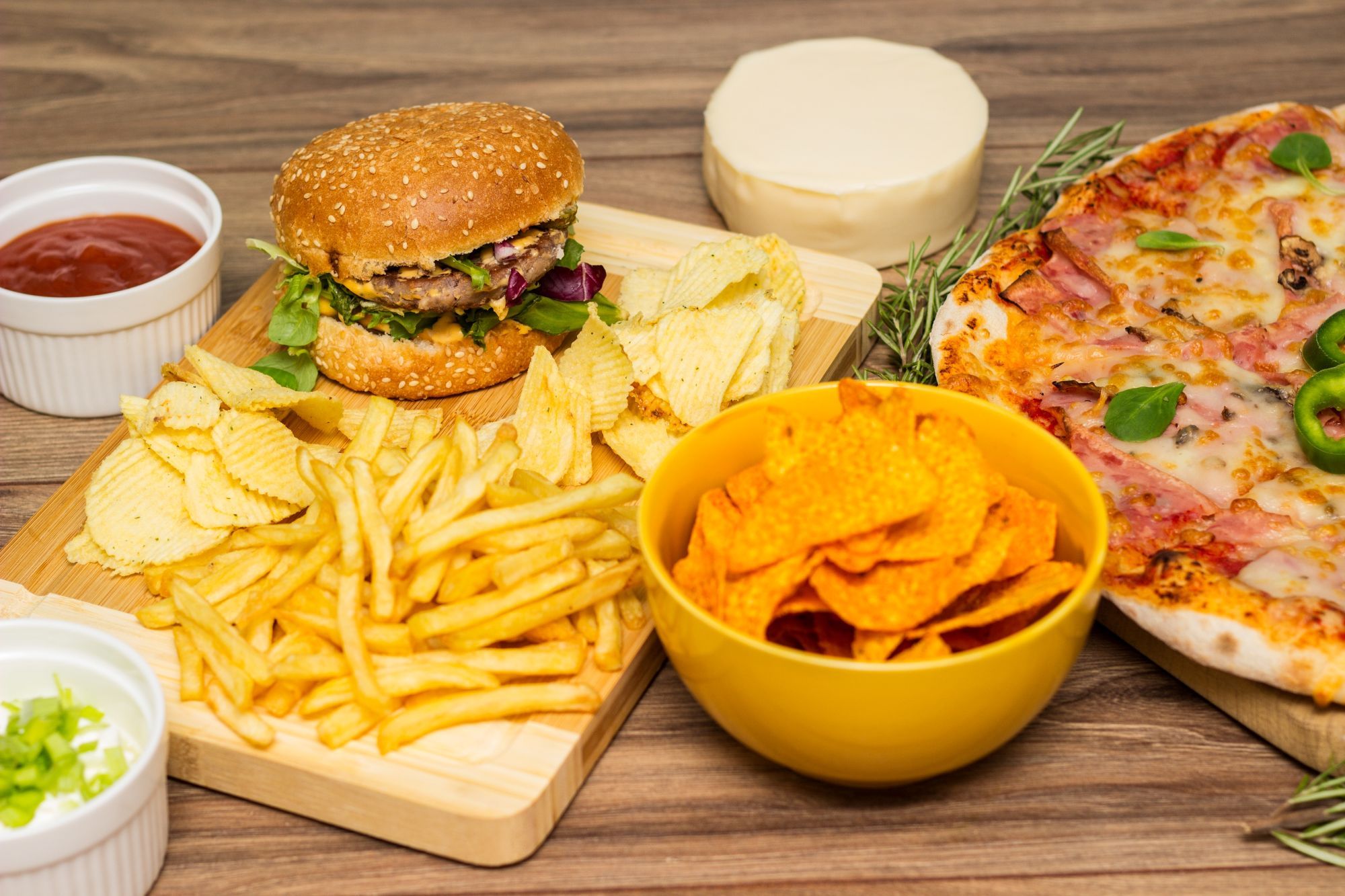 Chifla, carne de vita, salata verde, bacon, cheddar, rosii, castraveti murati, sos de burger, cartofi prajiti - 400g