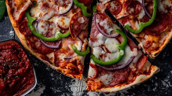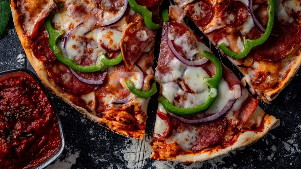 Carnati, salam, bacon, ceapa rosie, mozzarella, ardei gras, sos de roșii - 1kg