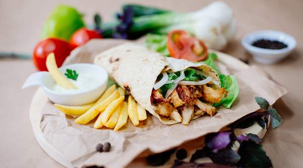Carne Pui 80g, Salată iceberg 30g, Varză 25g, Castraveți Murați 20g, Ceapă 10g, Pită Grecească 120g.