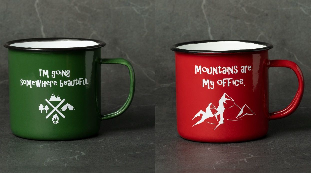 Cana emailata "Mountains Are My Office" rosie, 330 ml