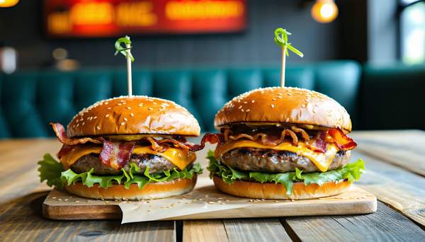 300 g-Chiflă, sos burger homemade,carne vită Black Angus, bacon, ciupercă grill cu brânză de burduf, ardei copți,cheddar, fulgi de ceapă prăjităAlergeni: Gluten, Lactoză, OuValori nutriționale≈ 980 kcal | P-50 g | C-60 g | G-60 g