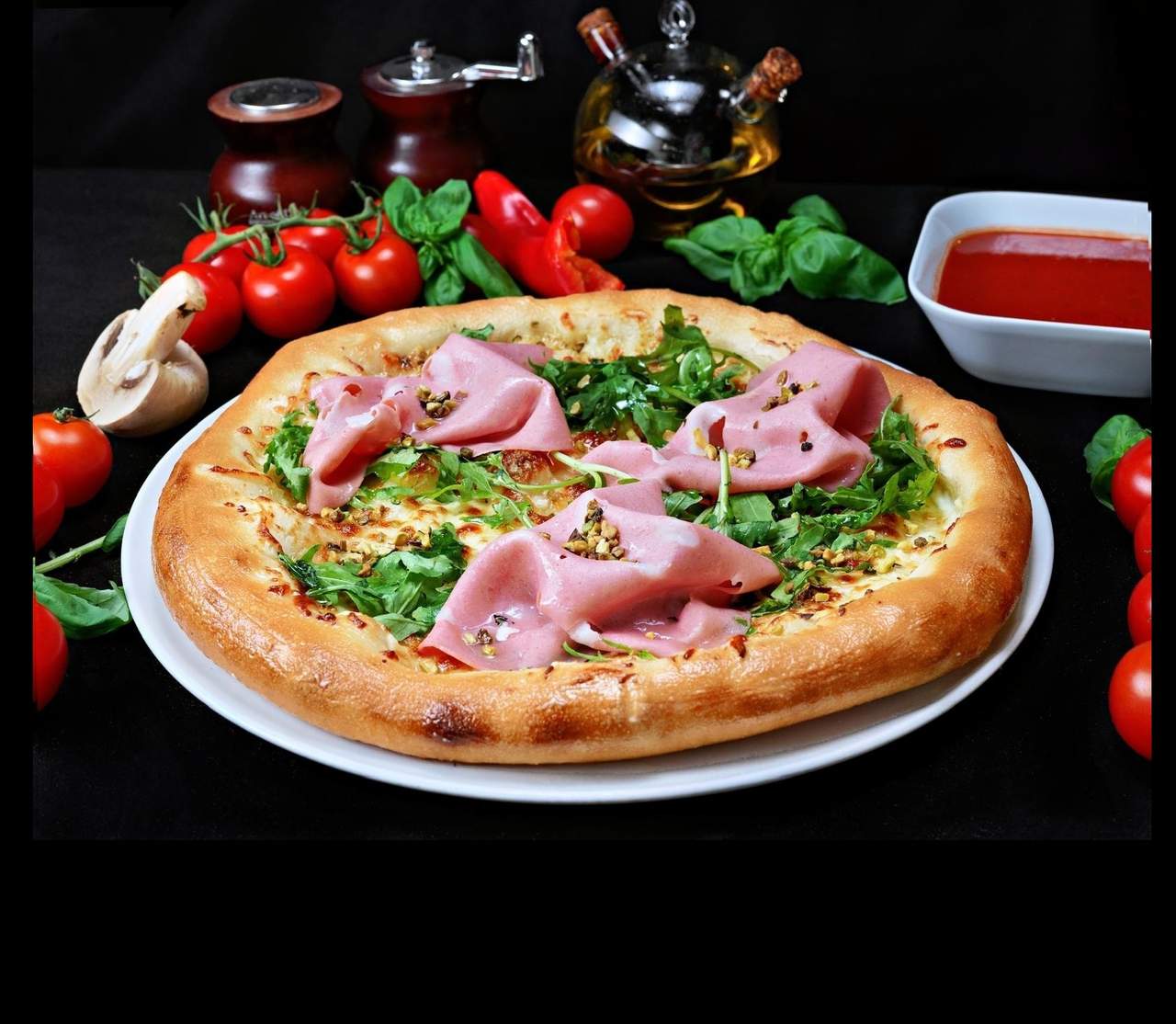 Aluat, sos de roșii, pizza topping, ciuperci fresh, masline, ardei kapia, Prosciutto cotto - 1350 g