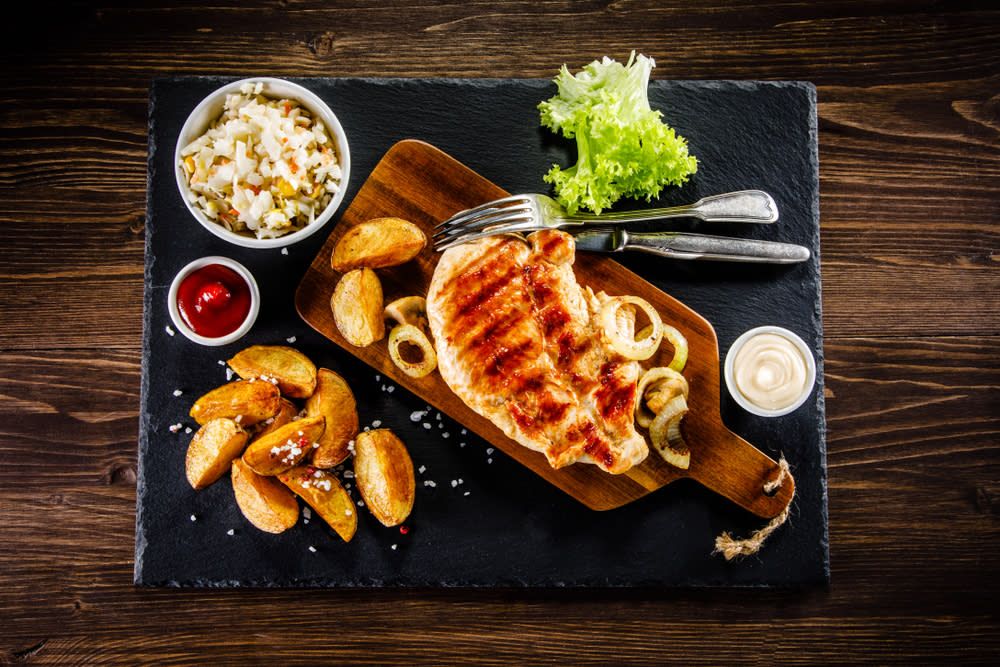 Piept de pui fraged și suculent, gătit la grătar, provenit de la păsări crescute natural. Servit cu o garnitură (140g/200g)