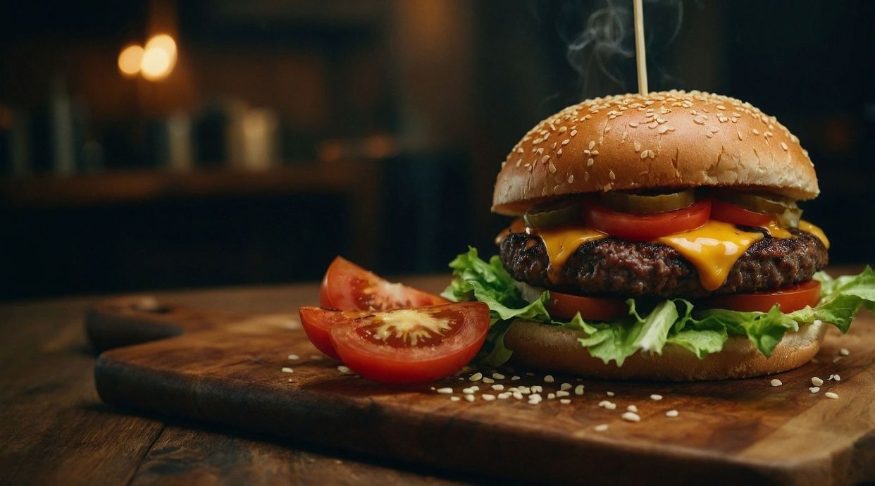 Antricot vită, castraveți murați, ceapă, bacon, salată iceberg, roșii, cașcaval, brânză Cheddar, sos Samura - 400g