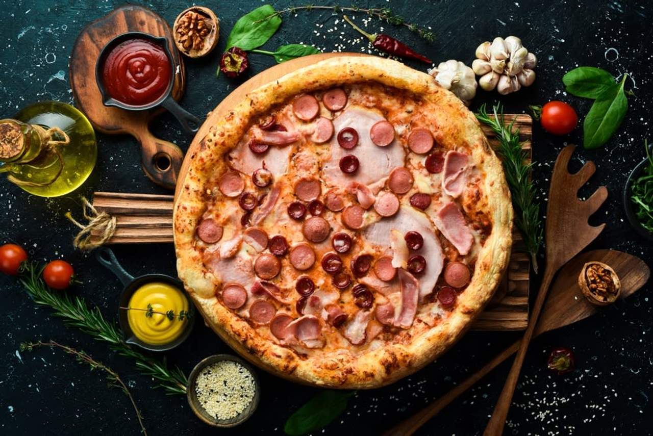 Sos rosii, bacon, carnati, masline, ciuperci, ardei gras, rosii, ceapa, mozzarella - 550g