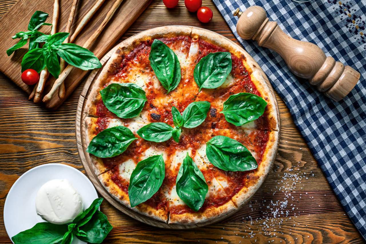 Blat pizza, sos de roșii, mozzarella fresca, busuioc