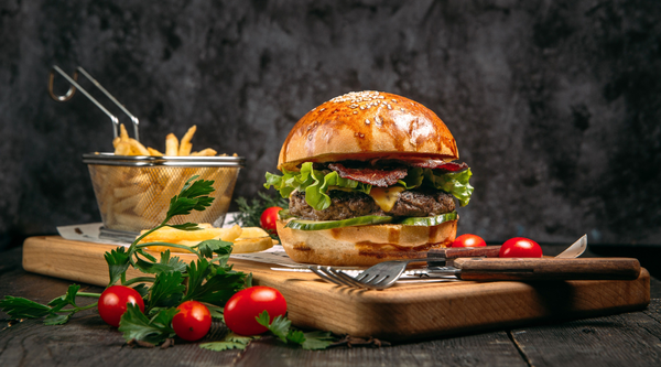 Chiflă cu Maia de cartof, carne vita premium x2, castravete murat, branza cedar, bacon, sos Bros/sos chillimayo- 350g