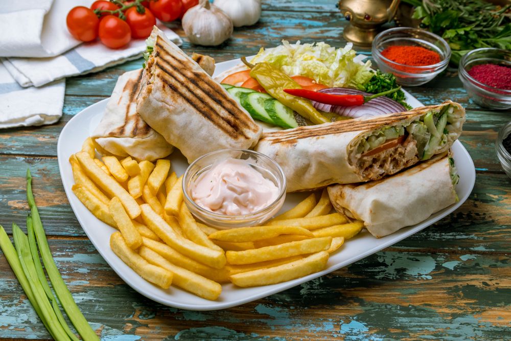 Carne de vita, carne de pui, cartofi/orez, 3 sosuri la alegere, lipie, varza si morcov, castraveti, rosii, porumb, feta, ardei iute, ceapa, ceapa prajita - 500g