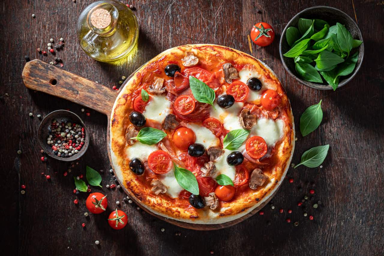 Aluat, sos de rosii, mozzarella, ton, masline, ceapa rosie, lamaie - 500g
