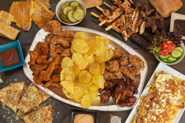 Cartofi prăjiți pai 400gr, telemea de vacă 100gr, ceafă de porc 380gr, frigărui din piept de pui 220gr, piept de pui pe grătar 300 gr, castraveți în oțet 250 gr, mici porc-vită 220gr, 4 chifle - 240gr, 4 sosuri la alegere - 2110 gr