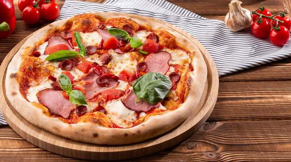 Blat, sos de rosii, mozzarella, sunca de porc, ciuperci, masline - 595g