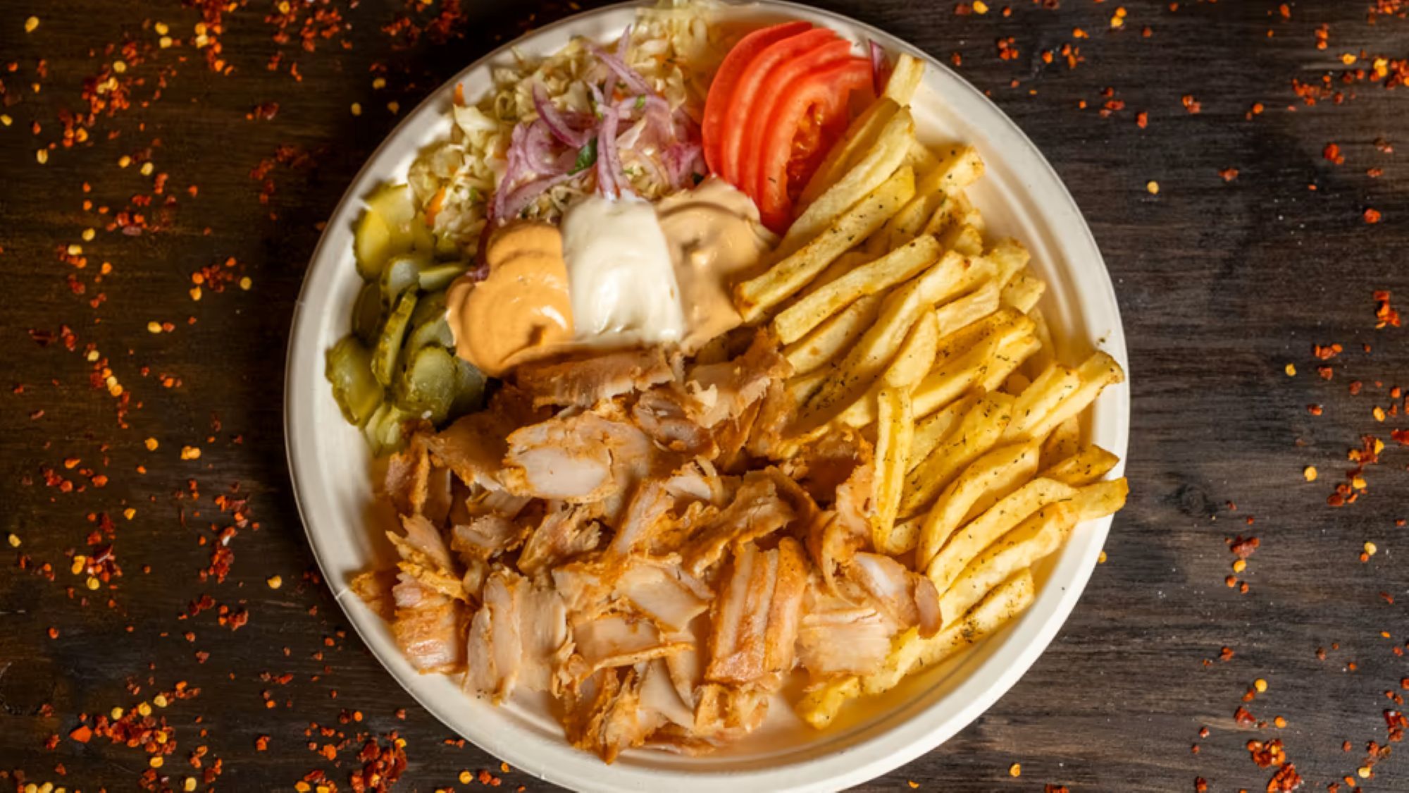 Carne de pui rotisată, lipie, cartofi pai de casă, roșii, castravete proaspăt / murat, varză asezonată, ceapă roșie cu sumac - 550g