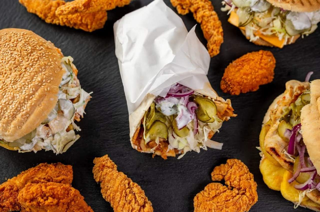 Chifla, carne de pui, cartofi, sosuri si salate la alegere