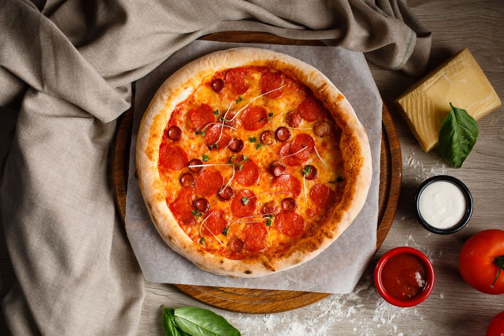 Aluat (270g), sunca presata, bacon, carnati, masline, ardei kapia, mozarella, patrunjel, sos