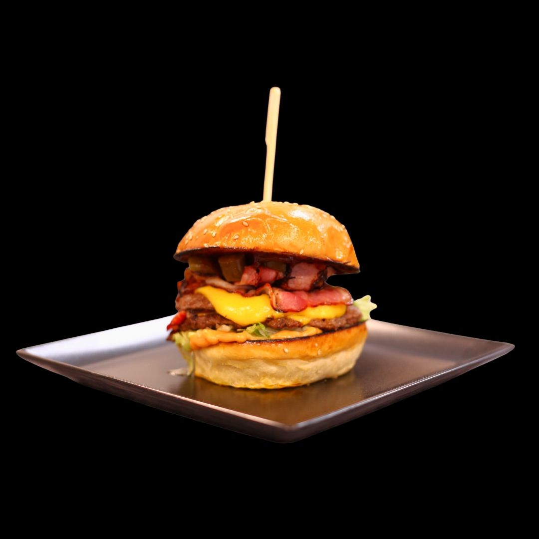 Chiflă , Bacon , chorizo , Carne Burger Smash ,cheddar , Castraveți Murați , sos Bbq , sos Rose , Cartofi crocanți 1200 g