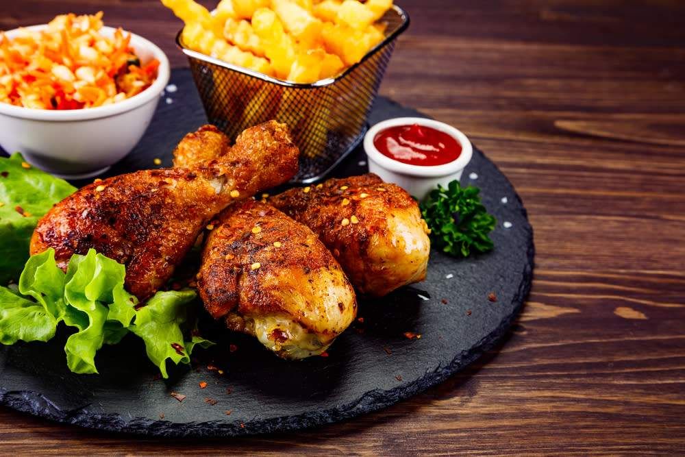 gratar din piept de pui, cartofi pai, salata asortata, sosuri, chifla (350 gr.)