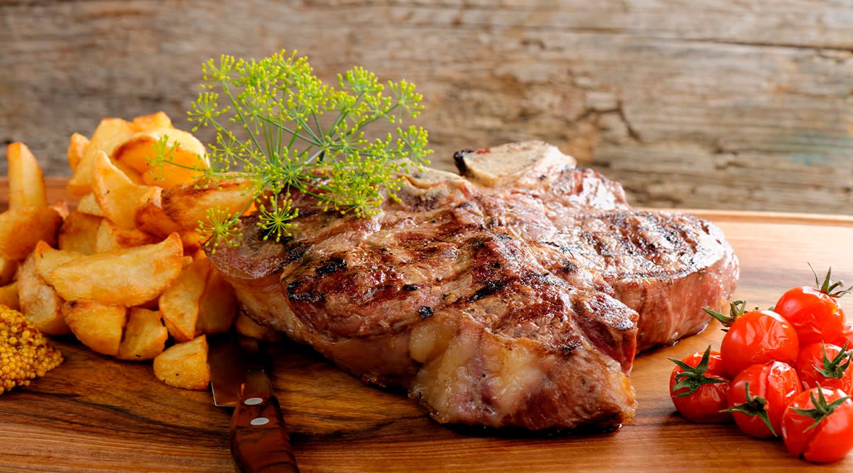 Cotlet de porc cu os, cartofi, lapte, unt, rosii cherry, sparanghel