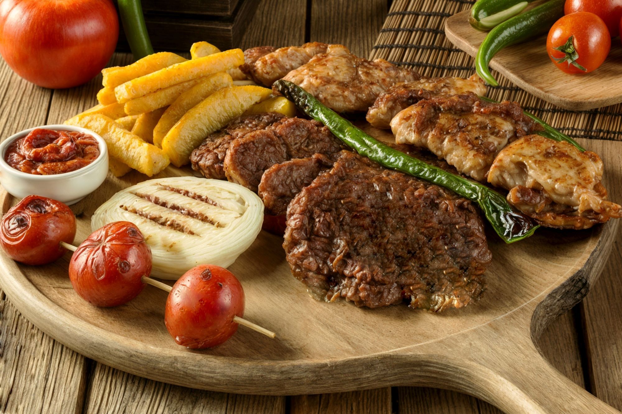 Piept de porc, ceafă de porc, pulpă de pui, aripioară, cârnăciori marinate și condimentate, alături de o salată perfectă de varză sau murături