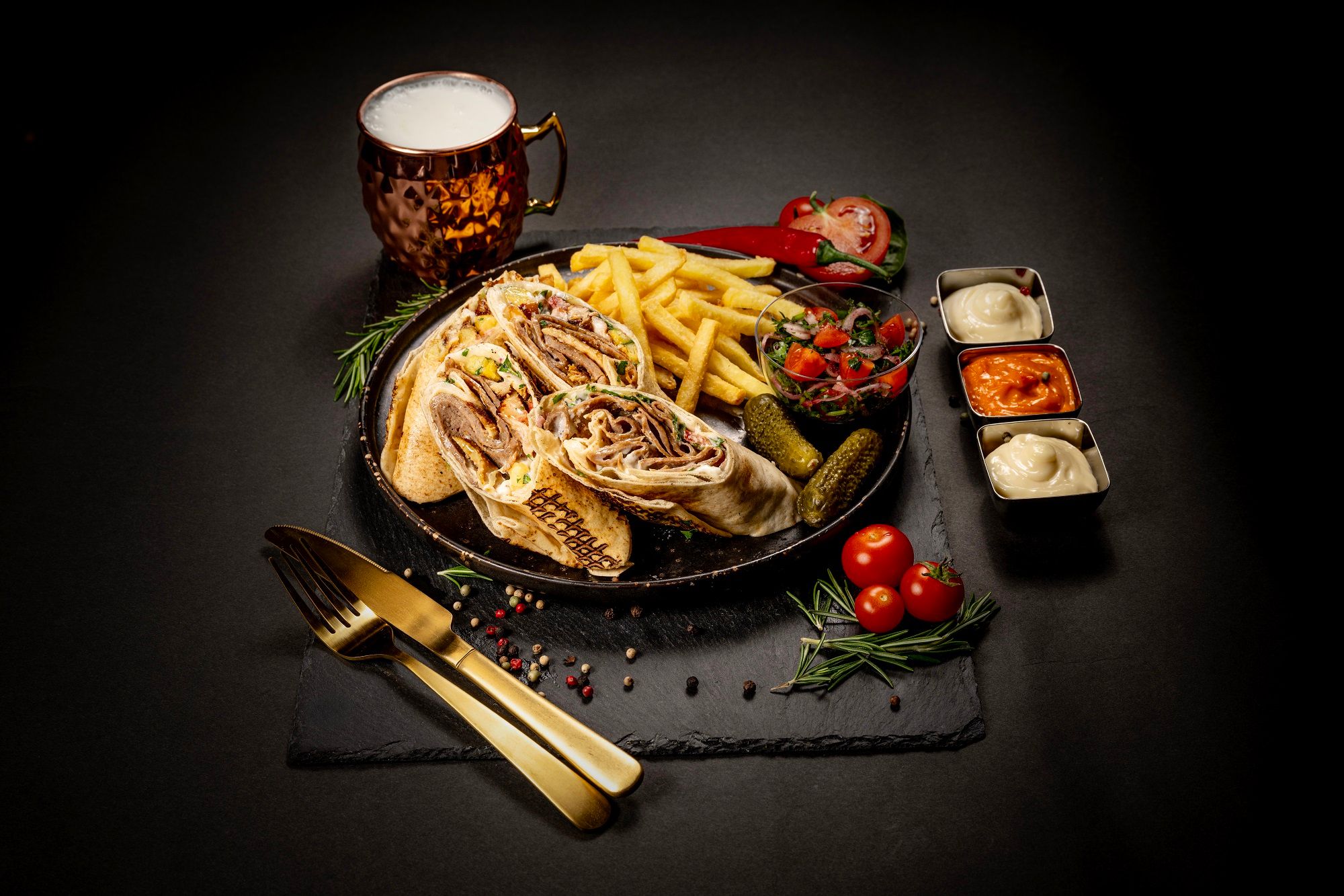 Shaworma lipie pui/ vita/ mixt, rosii, castraveti murati, cartofi, sosuri (mixte) - 550g
