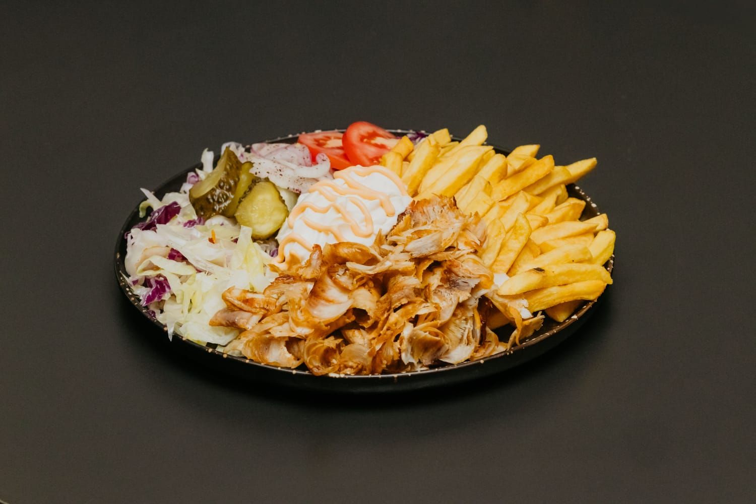 Carne rotisată de pui, cartofi pai, sosuri, varză albă/roșie, roșii, castraveți murați, ceapă, lipie – 500g