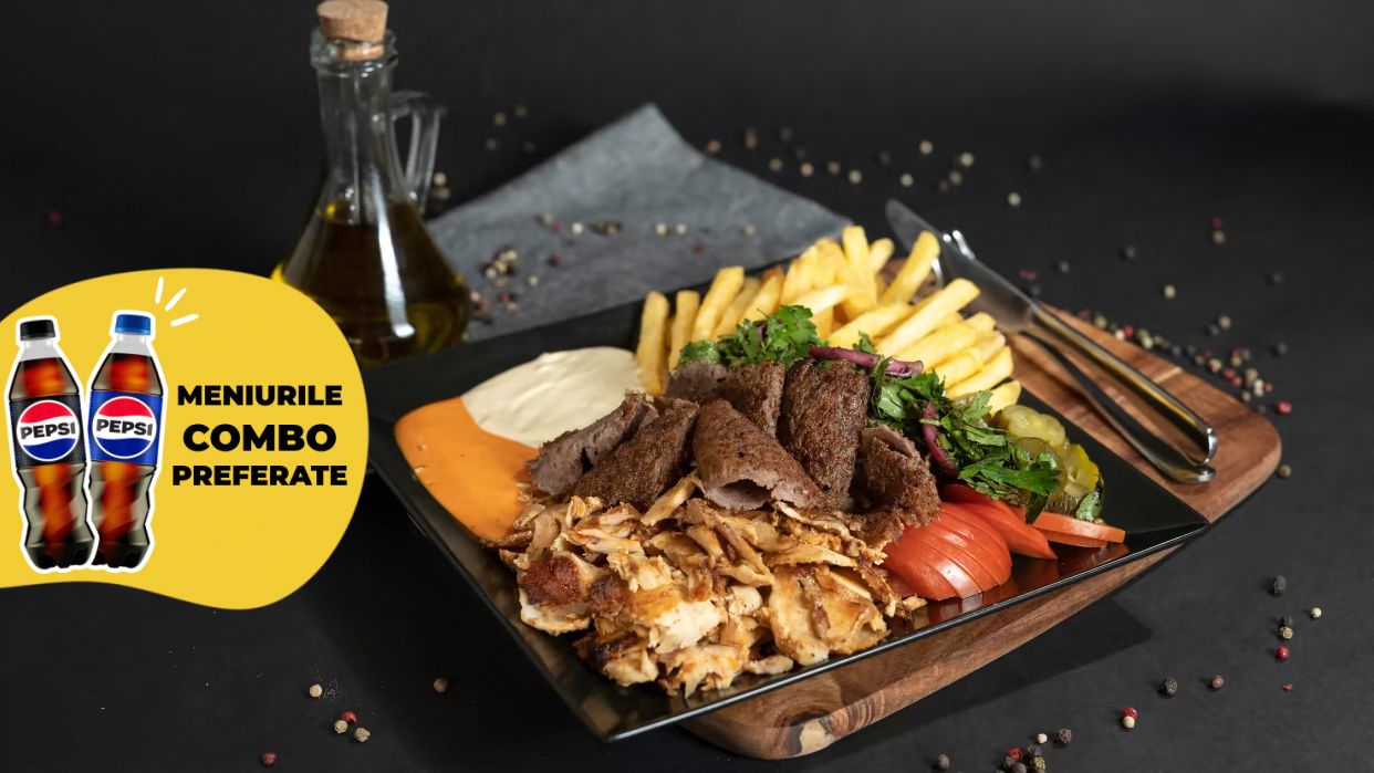 Carne de pui si carne de vita Angus rotisata, rosii, patrunjel si ceapa, castraveti murati, cartofi, sos tahina, maioneza, sos special - 400g+Ayran