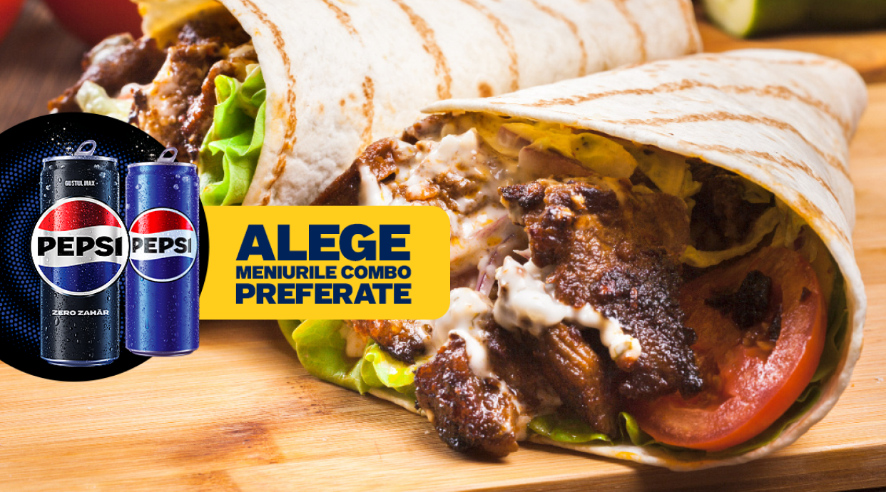 1 shaorma saj pui mare (450-500g) + cartofi (150g) + murături (50g) + sos la alegere (50g) + bautura la alegere (500ml) = 700g + 500ml bautura la alegere