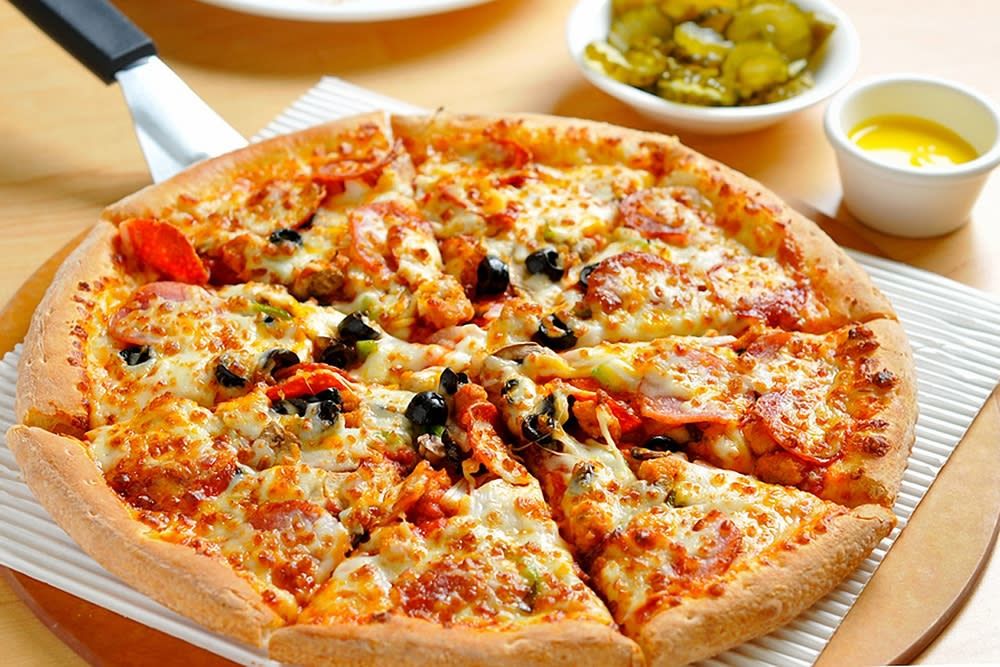 Ceapa, ardei gras, ciuperci, sunca presata, felii carnati porc, salam porc, salam tip sibiu, felii de rosii, masline, patrunjel