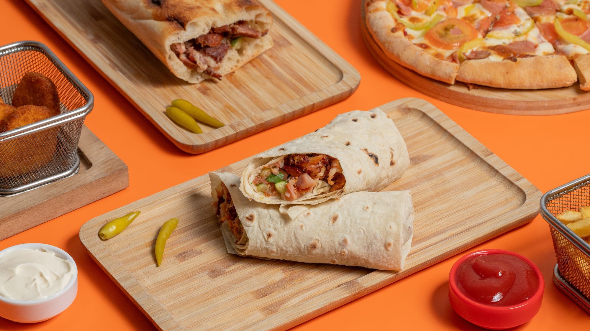 Lipie, piept de pui rotisat, cartofi pai, salată de varză, castraveți murați, sosuri la alegere - 330g