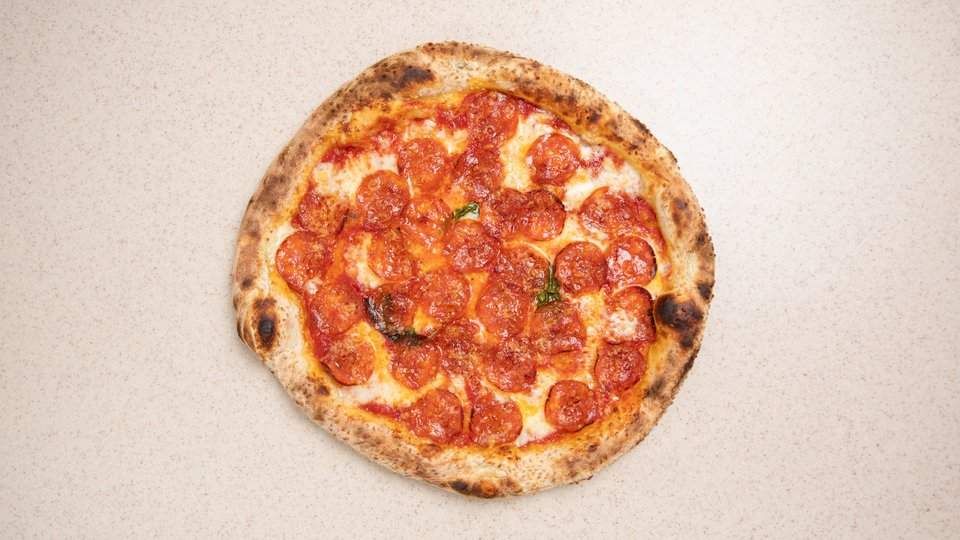 Aluat pizza cu susan, sos dulce de roșii, busuioc proaspăt, mozzarella fior di latte, salam pepperoni, parmezan - 530g