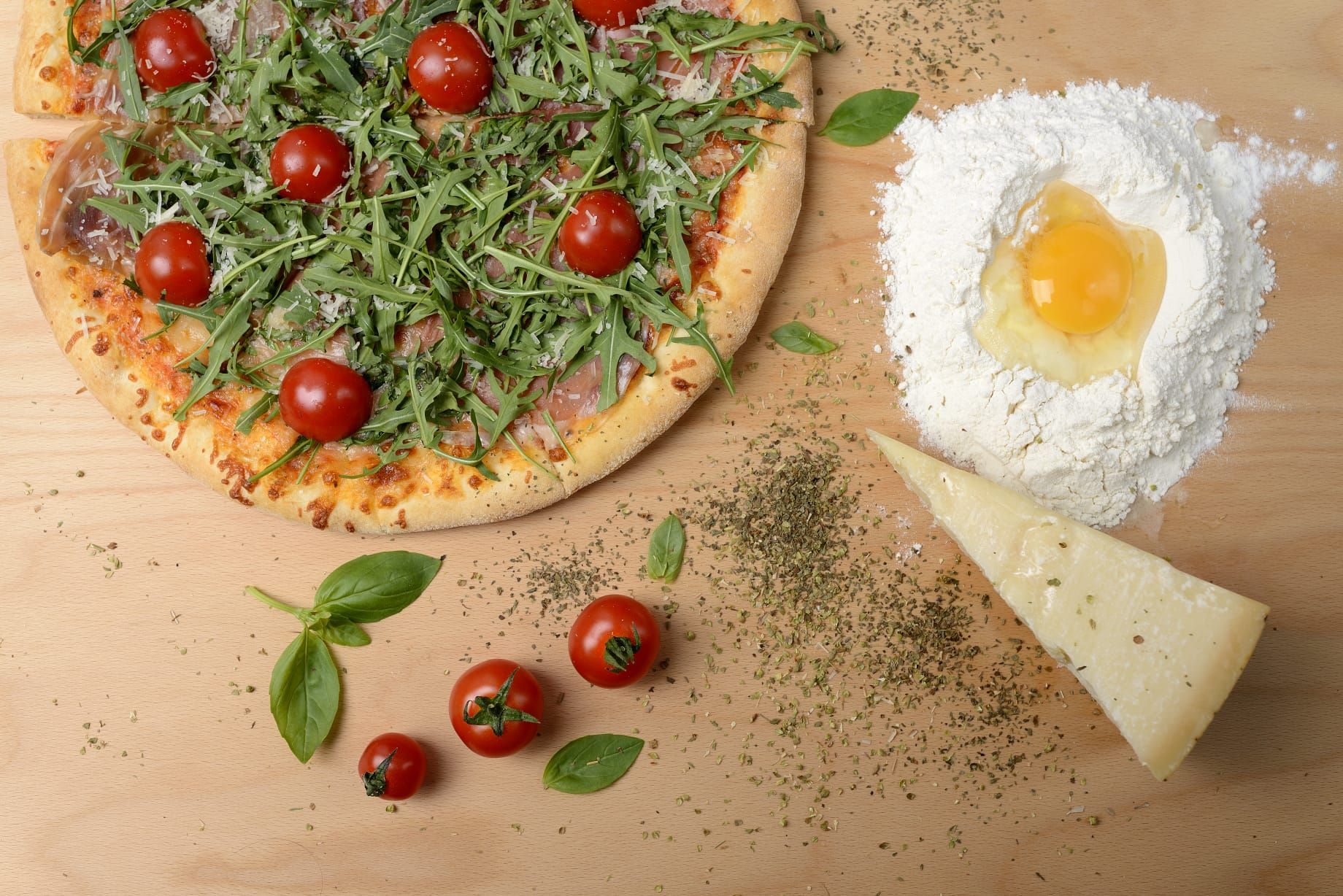 Mozzarella bivoliță, sos pomodoro, prosciutto crudo, rucola, roșii cherry, parmezan - 500g