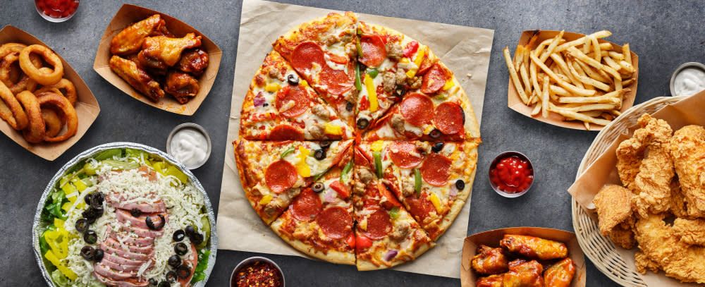 10 crispy strips 500g, 10 aripi de pui, 10 iinele de ceapa, 10 roluri de shawarma de pui , mixt de cartofi prajiti