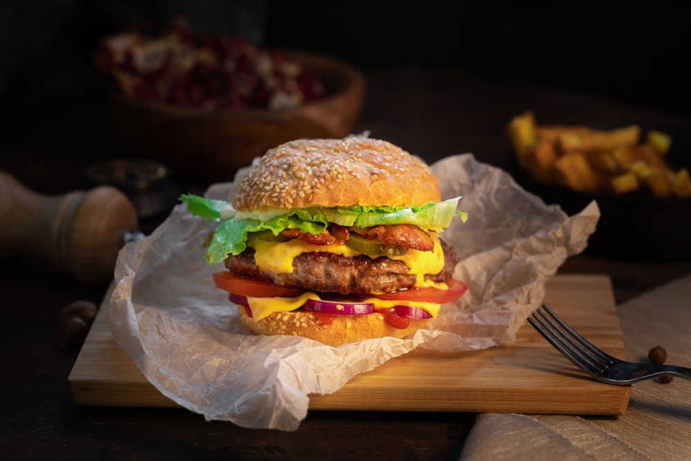 Carne tocata de vita, branza ceddar, bacon, salata verde, castravete murat, rosie, sos BBQ, cartofi - 500g