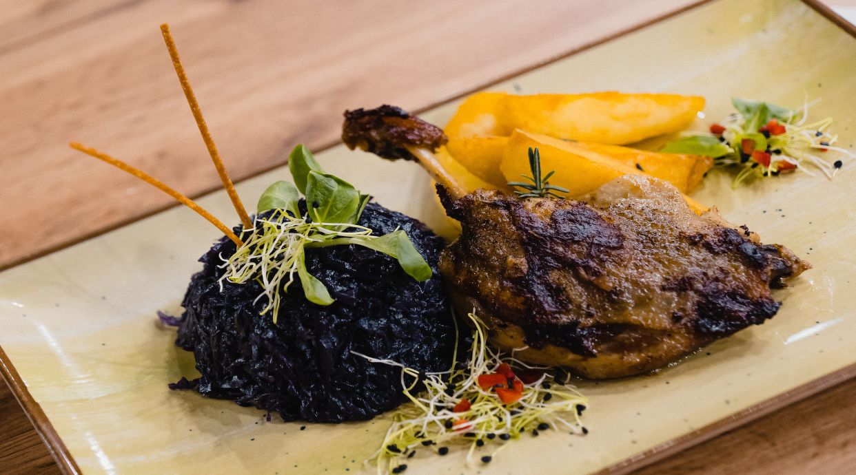 Pulpă de raţă, varză roșie călită, cartofi copţi