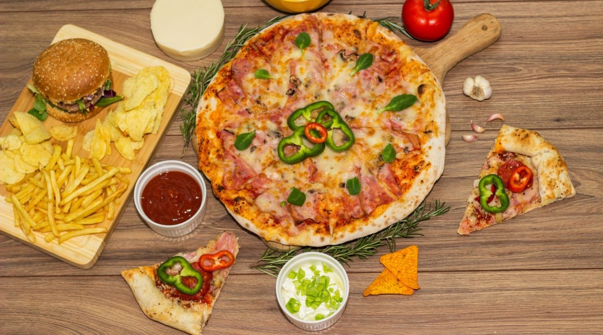 Aluat, sos de rosii, sunca, salam, ciuperci, porumb, ardei, mozzarella - 600g